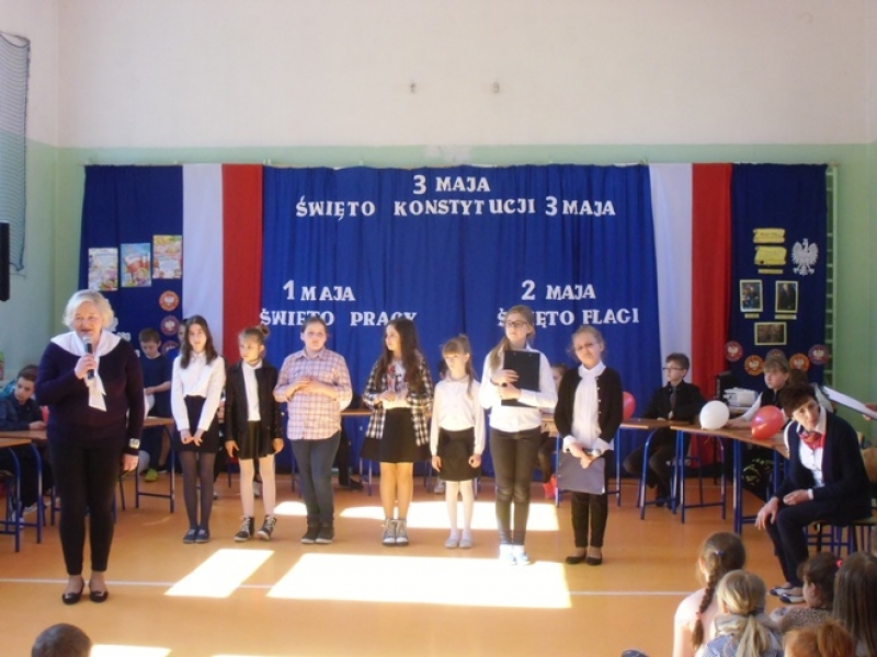 Po części oficjalnej którą rozpoczęła Pani Dyrektor uczniowie odśpiewali hymn państwowy oraz szkolny.  Uczniowie z klasy IV a przedstawili wiadomości dotyczące uchwalenia Konstytucji 3-go Maja. Następnie z klas IV-VI  wytypowano po 2 uczniów którzy wzięli udział na forum szkoły w Konkursie o Konstytucji 3-go maja. Kto pierwszy ten udzielał odpowiedzi na pytanie. Przygotowanych zostało 40 pytań